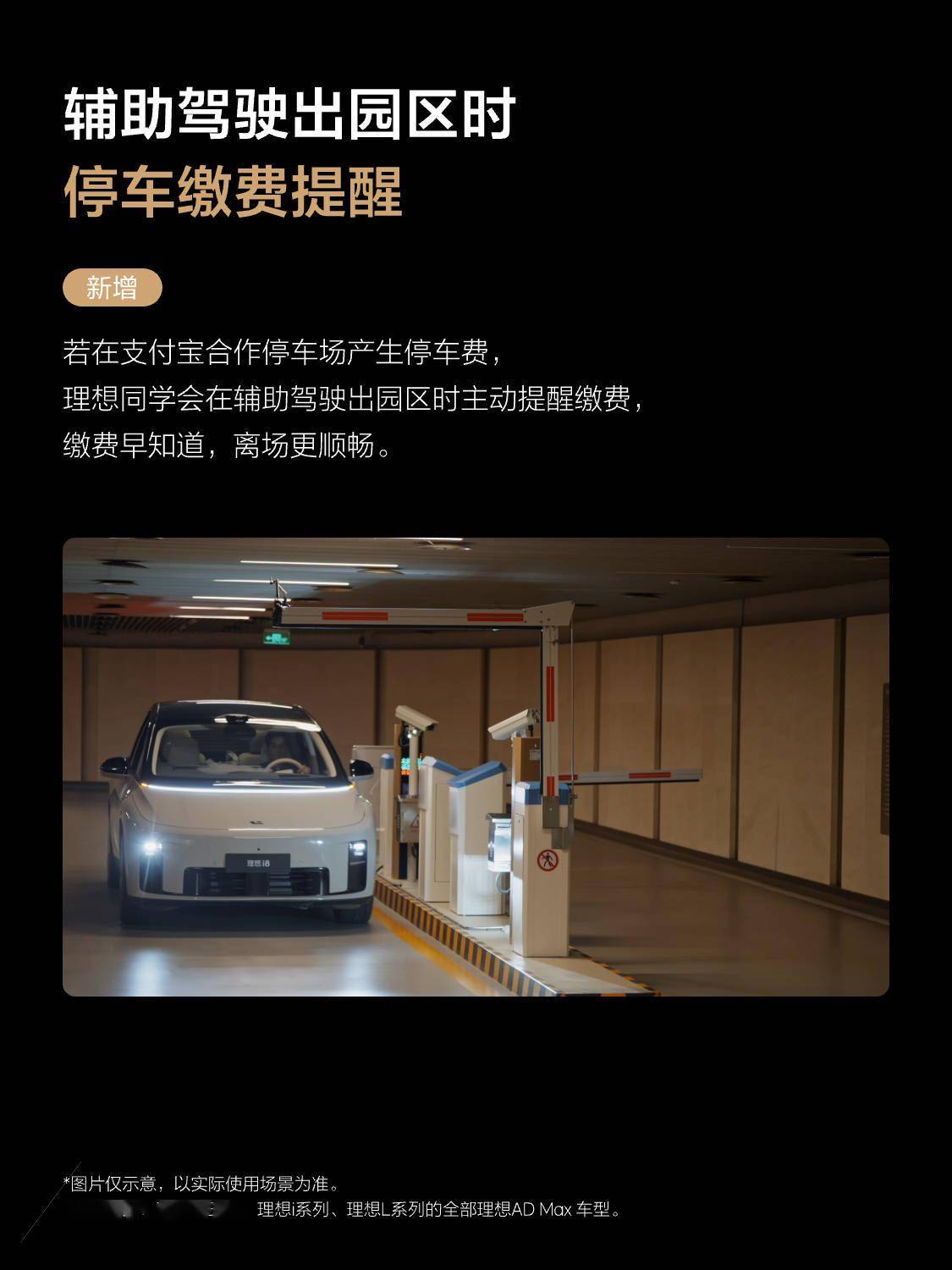- 辅助驾驶出园区时停车缴费提醒。若在支付宝合作停车场产生停车费,理想同学会在辅助驾驶出园区时主动提醒缴费。
