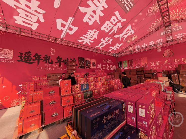 目前,重庆双福国际农贸城已启动年货节,整个市场目前以坚果、水果、肉类等为主题在开展促销活动,上百个商家晒货吸引市民囤年货。展销区的棚架被装饰成红彤彤的一片,营造出红红火火的年味氛围。