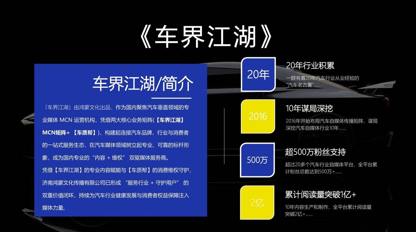 作为国内聚焦汽车垂直领域的头部 MCN 运营机构,车界江湖 MCN深耕行业 20 年,自 2016 年布局自媒体矩阵以来,已形成 “内容 + 维权” 双驱模式。旗下拥有【车界江湖】【车圈电事】【车界 EV】【老徐侃车】【毕老师的车生活】等全平台账号,累计粉丝超 500 万,全平台阅读量突破 2 亿,覆盖燃油车、新能源车全品类用户。