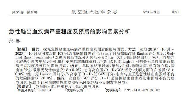 [1] 张 琳,急性脑出血疾病严重程度及预后的影响因素分析,航空航天医学杂志,2024-09-23