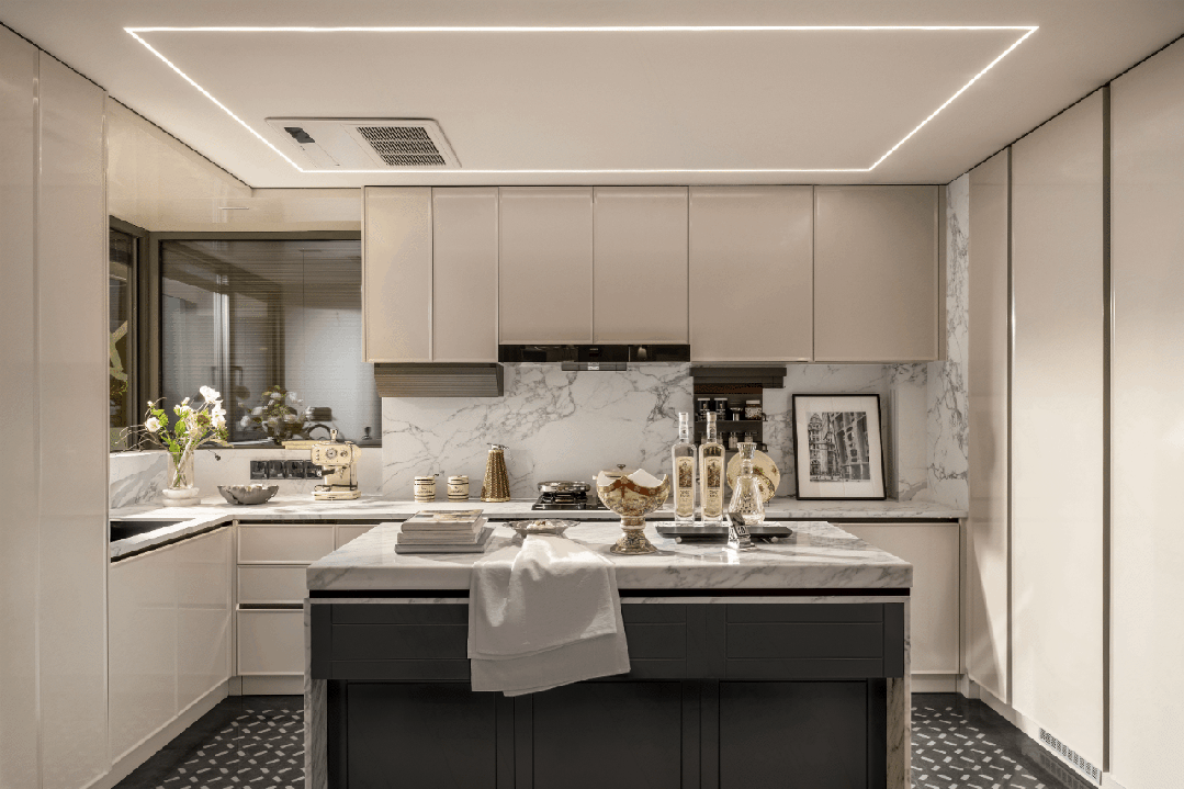 厨房的巨量收纳系统,超大尺度的中西岛台,既符合中式烹饪的实用逻辑,预留足够操作台面,又能承载西式社交,还有新颖的转角蝶形收纳——