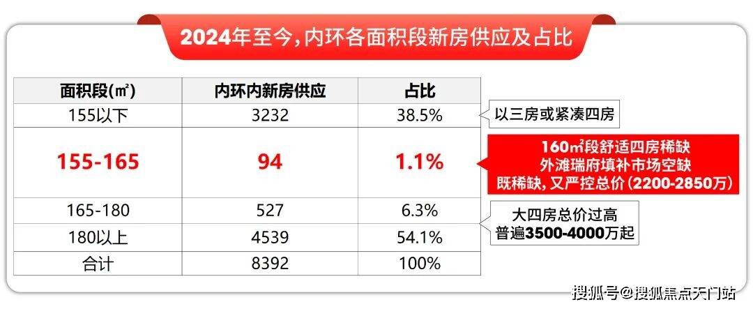 而在总价层面,外滩瑞府也是当下千载难逢的2200-2850万一步到位4房的机会。2024年至今,内环的四房供应起步面积段大约在180㎡,180㎡以上的四房供应占比55%,总价高昂,普遍在3500-4000万左右。