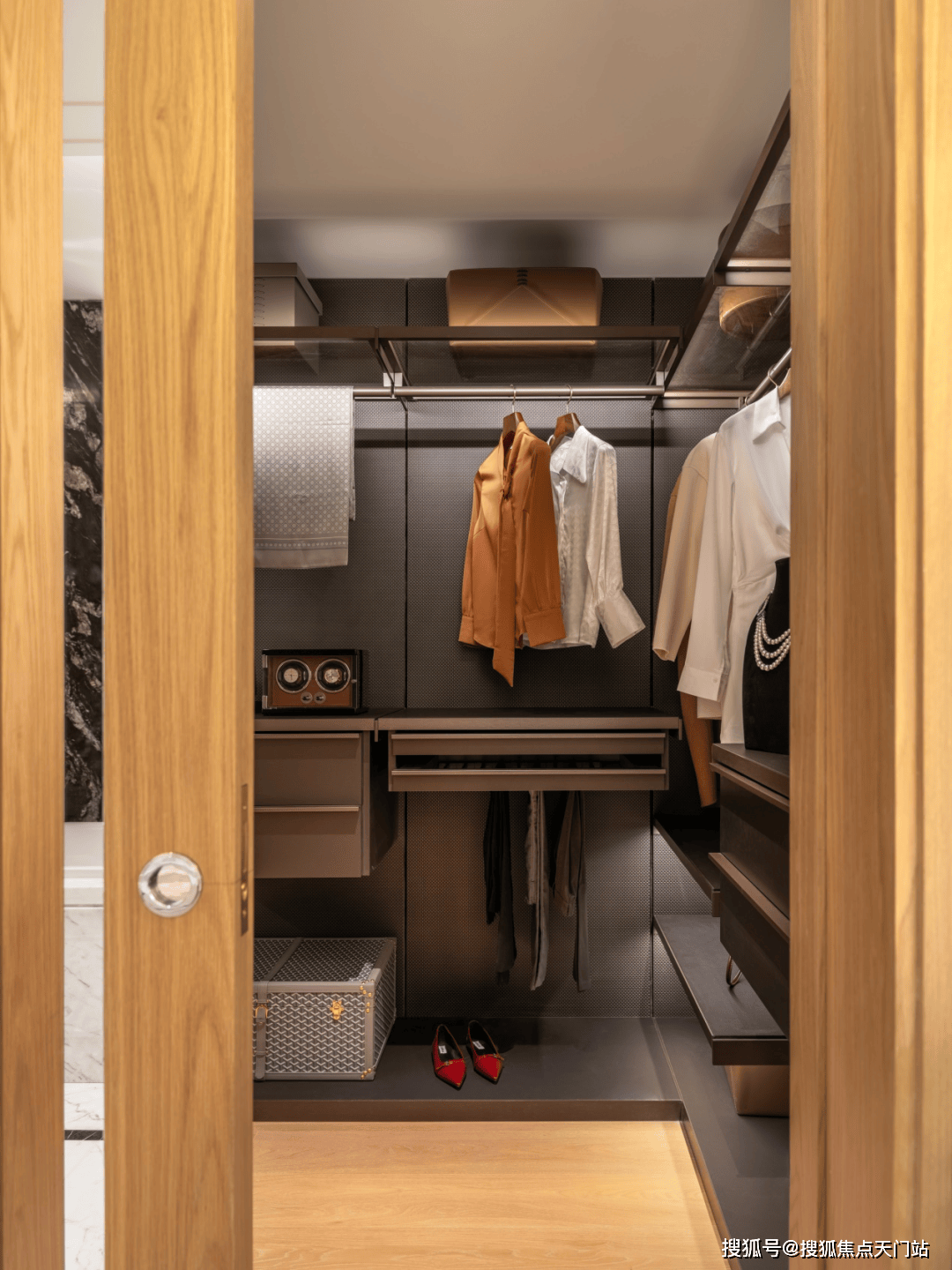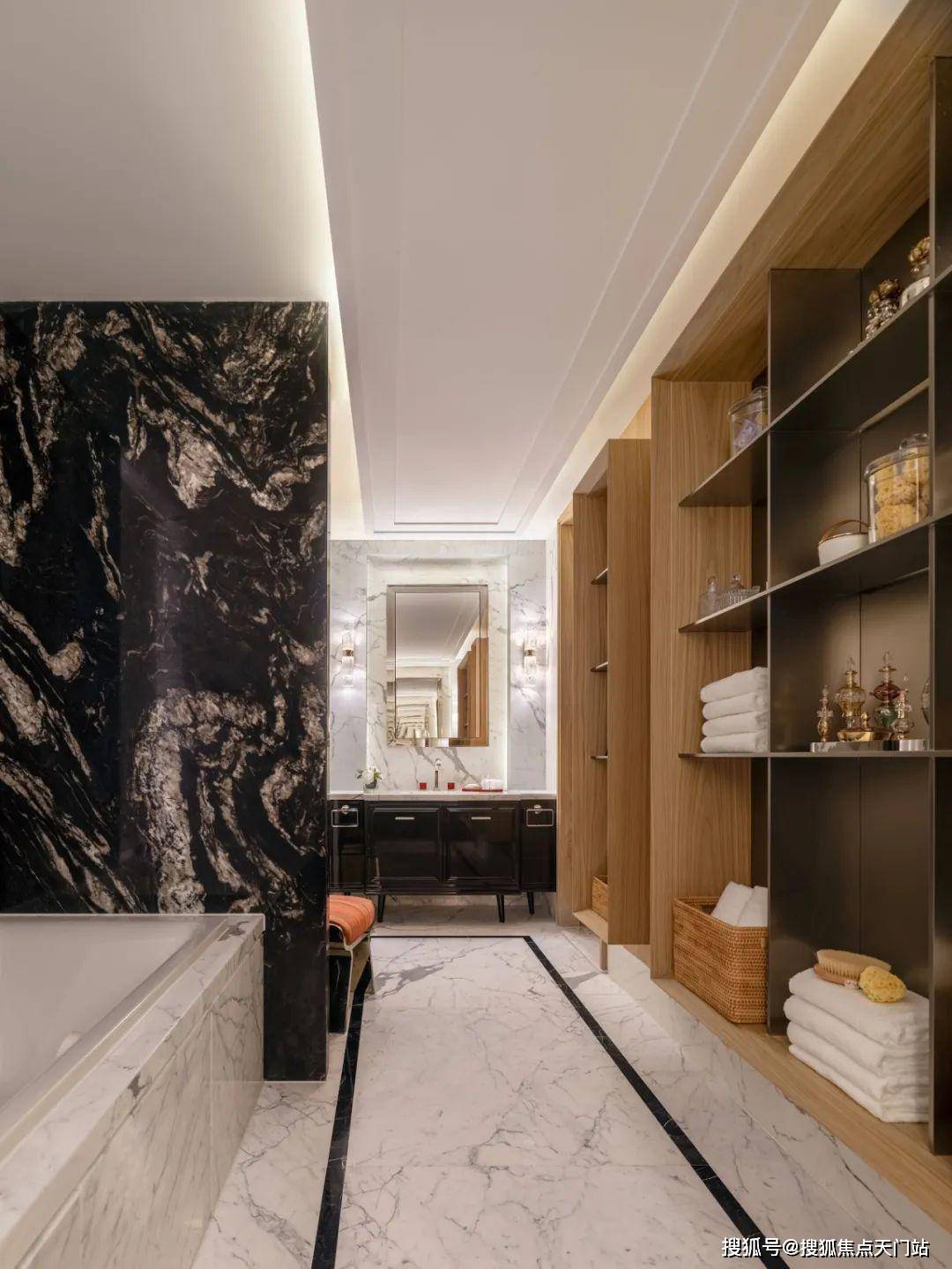 步入式衣帽间隐于卫浴内部,创造出一体化体验,金属质感的柜体材质,与卫浴石材形成对比,增加了视觉的丰富性。