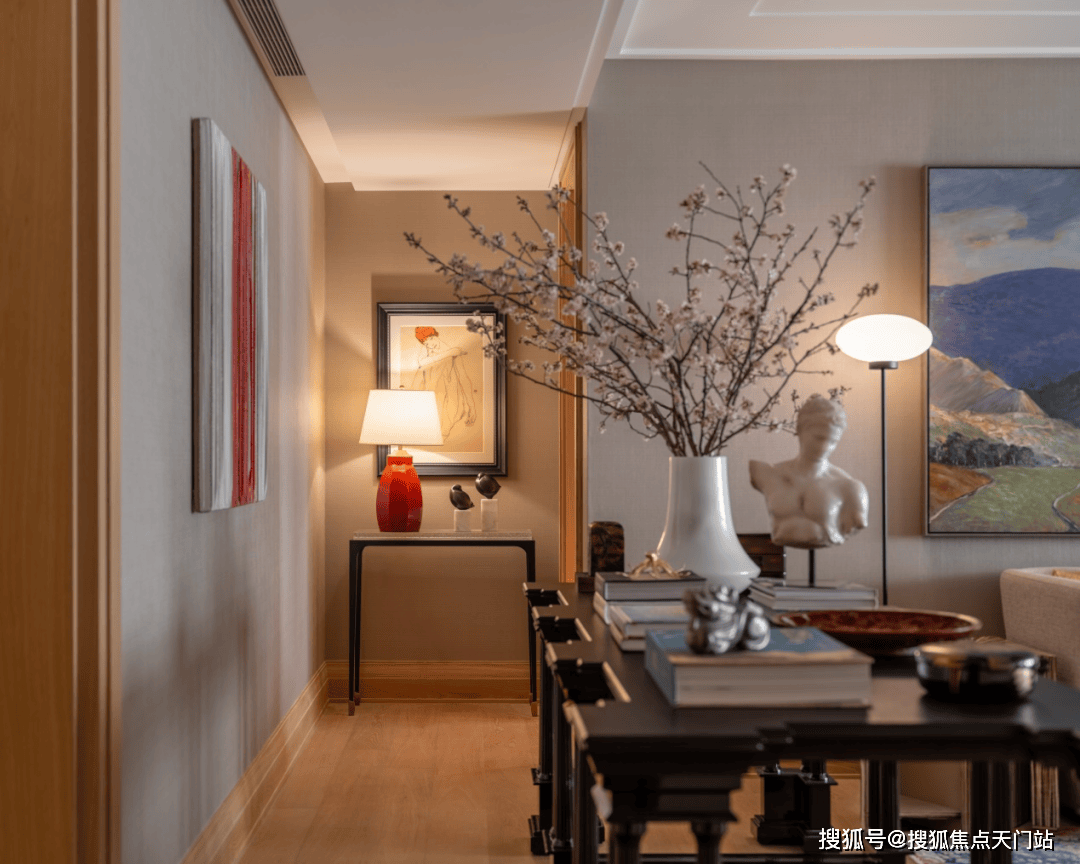 主要位置的多功能大长桌,可以做书桌,聚餐冷餐摆台,也可以做艺术品展示桌,让艺术与空间交融相生。同时,大长桌也起到了模糊走廊与客厅空间的作用,无形中放大空间的层次感,增添了空间的功能性。