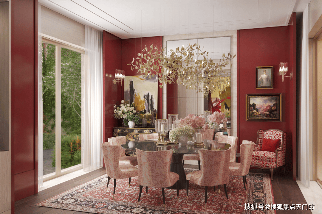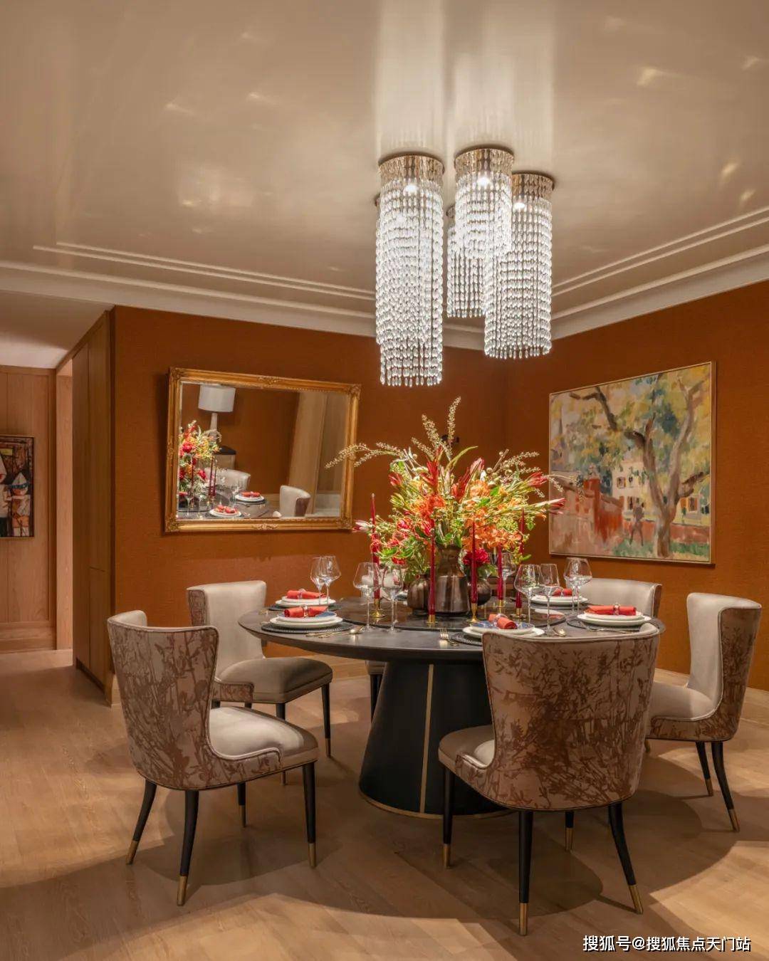餐桌上盛放的热带花卉与橘色亚麻帆布面壁纸,一同传递出热烈的情感,一幅展现自然风光的画作《The Old Walnut Tree B》丰富了空间的色调,在贵雅的氛围中妆点质朴与原始的美。