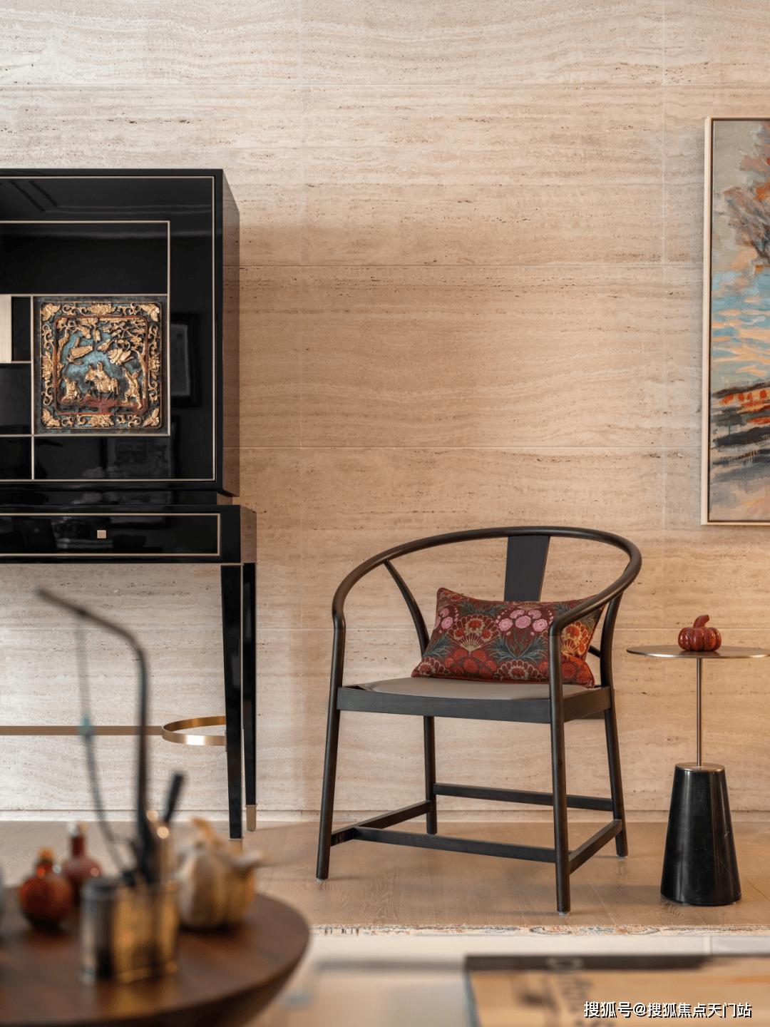 融合焕新的高柜摆放于洞石墙前,哑光与纹路丰富的米白洞石衬托出了高光黑色烤漆的深邃与沉静。而嵌入柜面的中式楠木挂屏无疑是点睛之笔,采用朱红鎏金工艺对人物和图案进行着色,展现了传统与现代融合的可能性。