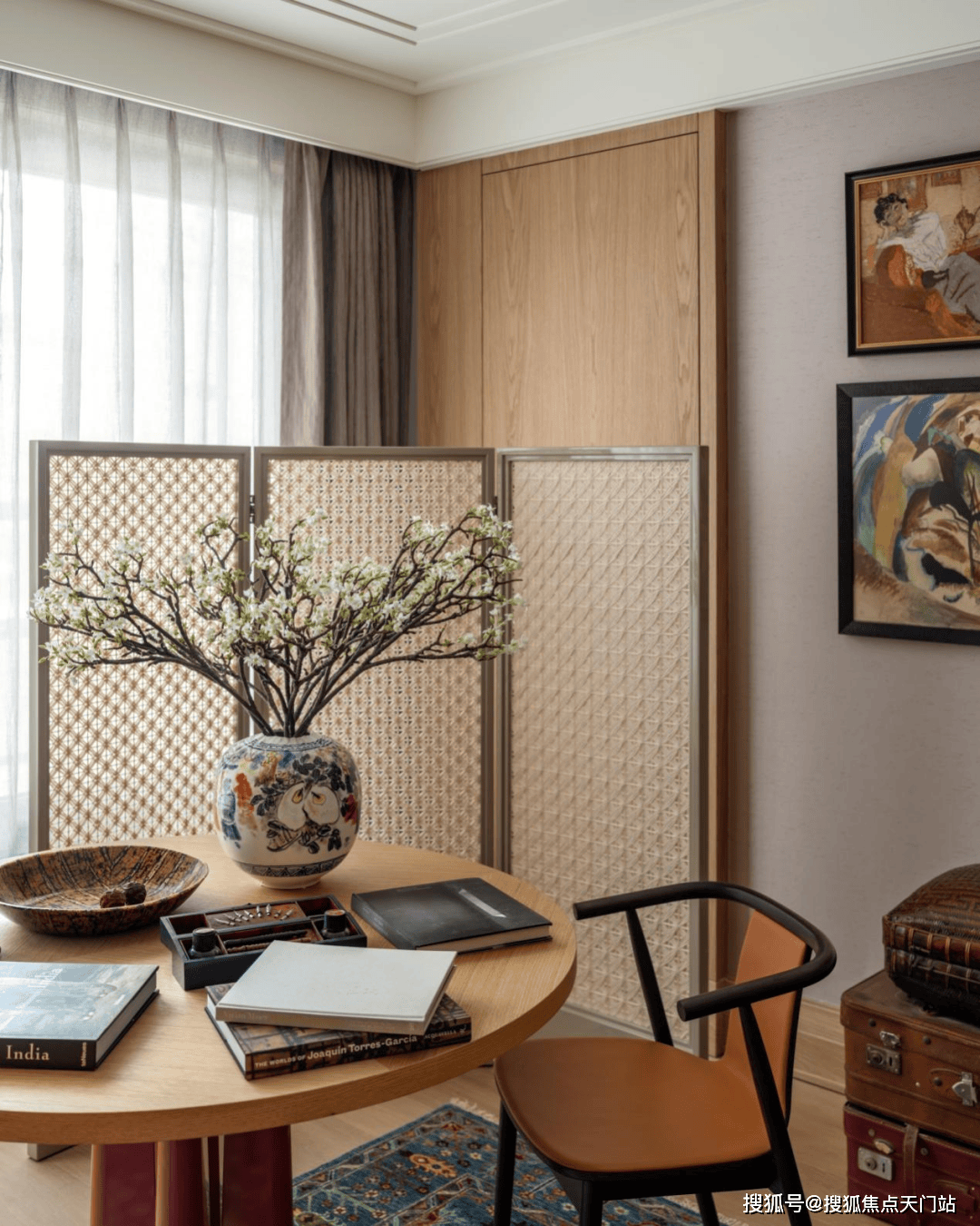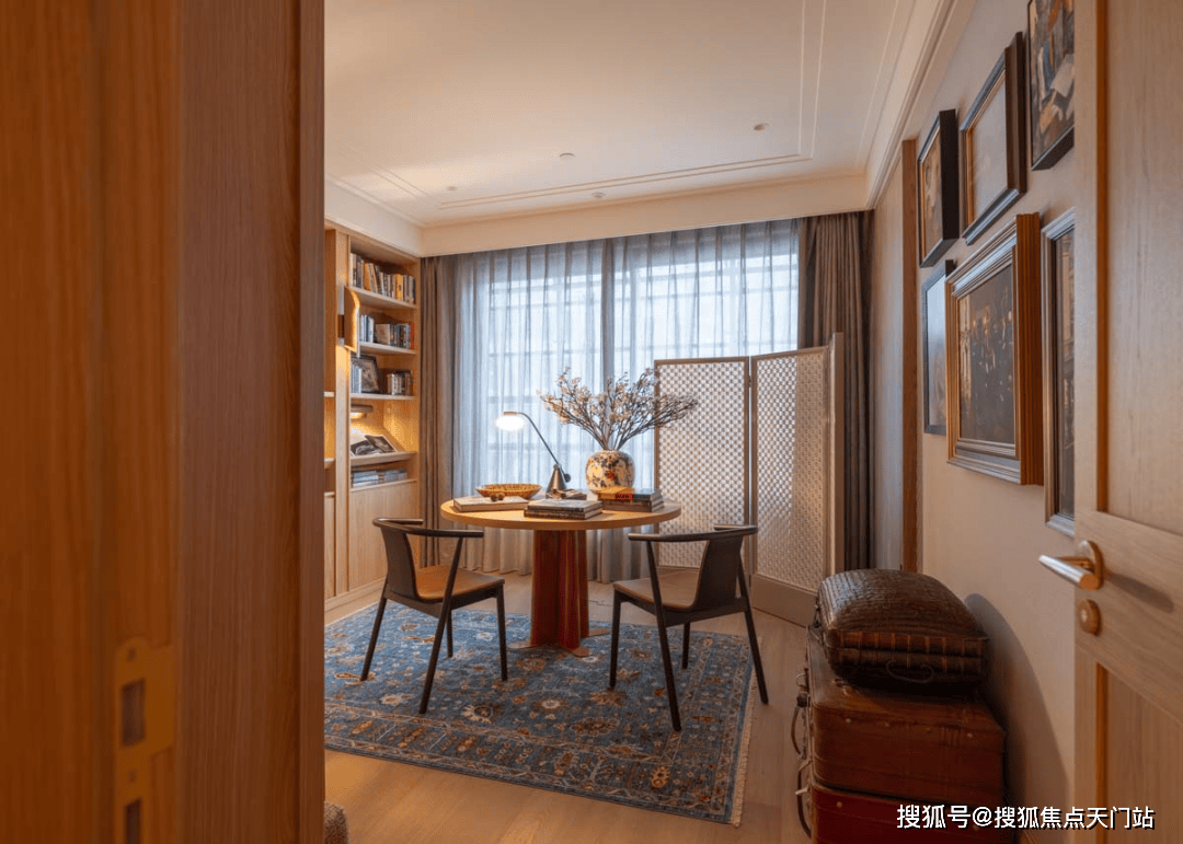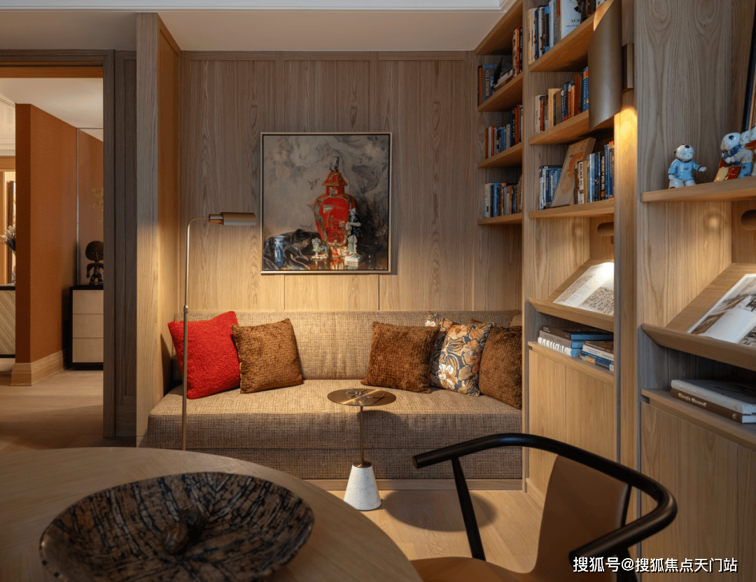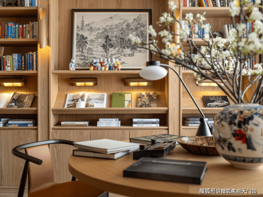 多功能书架彰显着设计的巧思,形成有如博物馆般的展示方式,即可放置日常读物,亦可展示珍本藏书。同时,利用屏风做隔断,与圆桌结合形成私密空间。