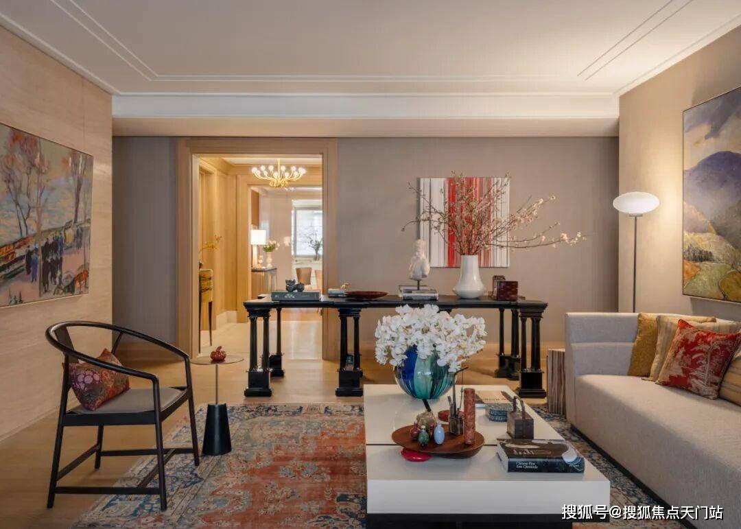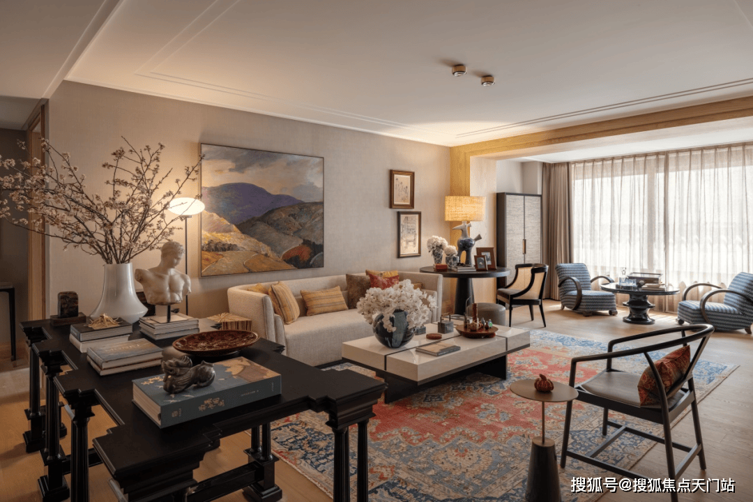 客厅,也是一处流动的空间,通过“自由灵活的组合”营造不拘束的社交空间,家具摆放,连而不挡,分而不隔。满目吸睛的艺术品,错落布置的家具,丰富着空间的视觉层次。