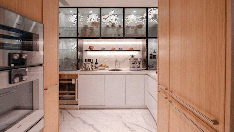 厨房采用洄游式立体布局,一半是“工作厨房”,隐于内部的中式厨房,有效避免油烟外泄,无论烹炸煎烤,空间之外清新依旧。