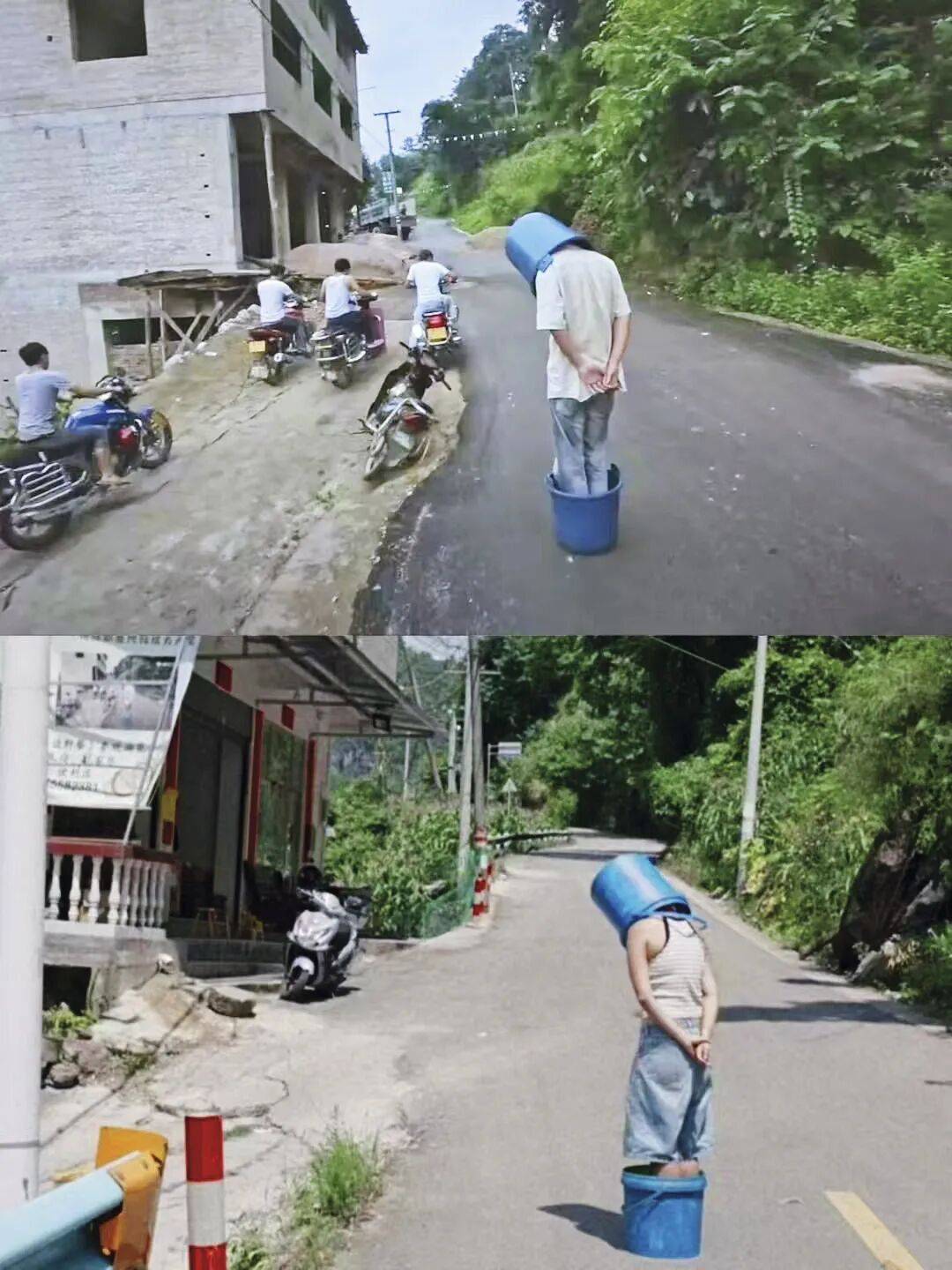 为了还原画面,张叔拿出两个蓝色的塑料桶,示意卡西双脚站在一个桶里,另一个桶则戴在头上。