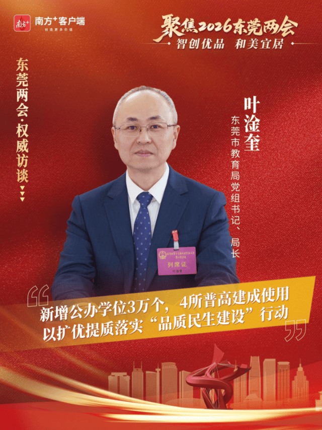 “今年政府工作报告深入贯彻市委十五届十次、十一次全会精神,紧紧围绕市委‘九大行动’部署铺开‘十五五’开局之年工作,形成了时间表、任务书、路线图,催人奋进。”东莞市教育局党组书记、局长叶淦奎在接受南方日报、南方+记者采访时表示,当前,群众对“有学上、上好学”的需求仍然迫切,也对教育“扩优提质”提出了新的要求,全市教育系统将只争朝夕,奋力攻坚,落实好市委、市政府“品质民生建设”行动工作任务,扎扎实实干起来,推动优质教育资源更充分、更公平覆盖常住人口。
