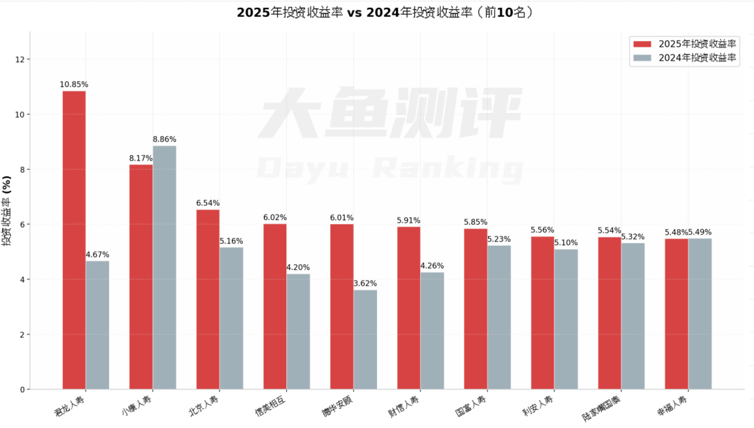 投资收益率中,君龙人寿以10.85%位于榜首,相比去年也是大幅增长,小康人寿以8.17%位列第二,北京人寿6.54%位列第三。全年共有18家公司财务投资收益率突破5%,整体表现亮眼。