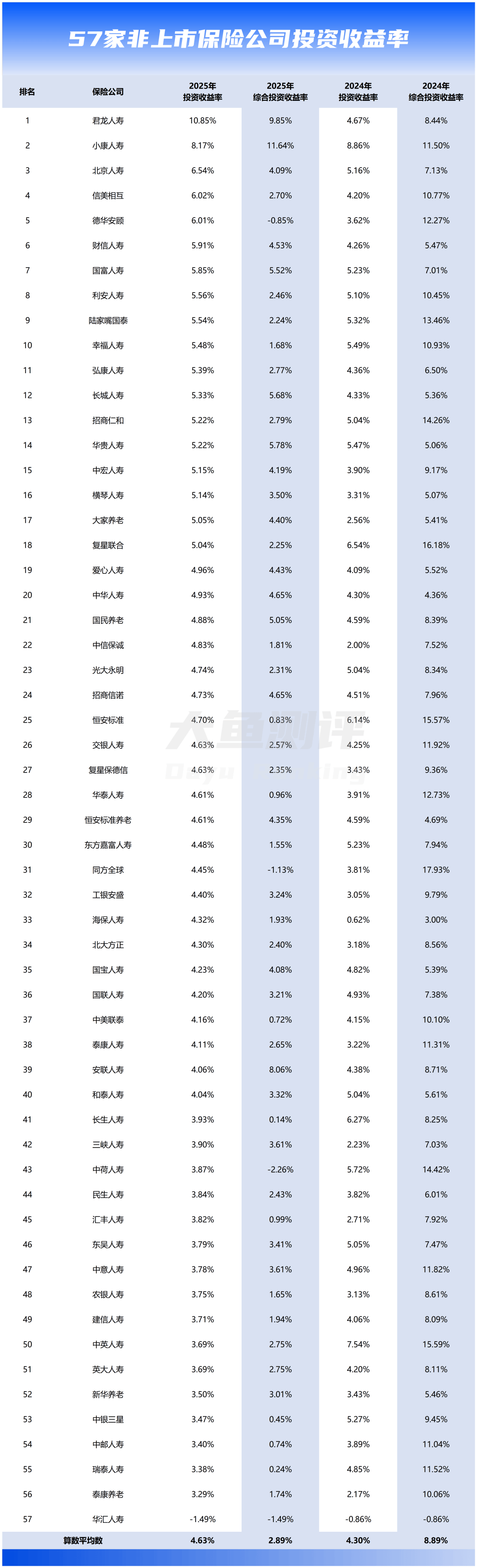 2025年非上市险企的平均投资收益率是4.63%,整体相比去年有所提升,但综合投资收益率恰恰相反,2025年非上市险企的平均综合投资收益率是2.89%,相比去年平均值(8.89%)出现大幅下滑。