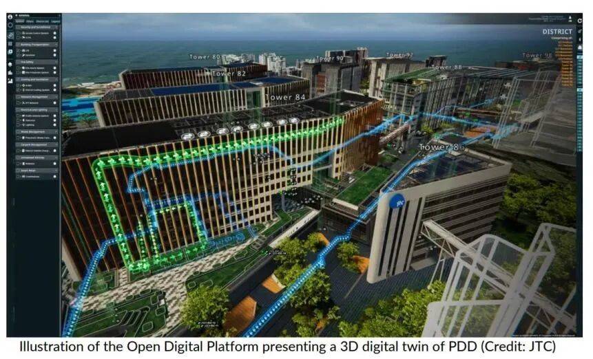 其首创的开放数字平台(ODP)能够实时收集园区传感器数据并共享给高校和企业,通过数字孪生加速科技解决方案和业务创新。它可以被看作一个数字公共基座,将园区内智慧电网、废弃物管理系统、电梯、安防等所有系统的数据接口标准化并开放,使园区成为一个“可编程”的实体。