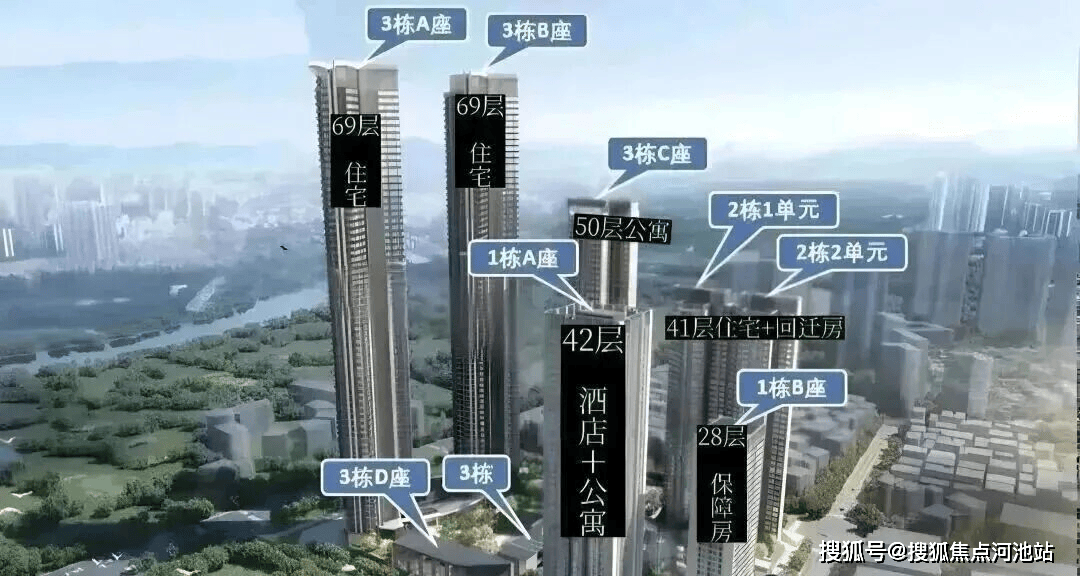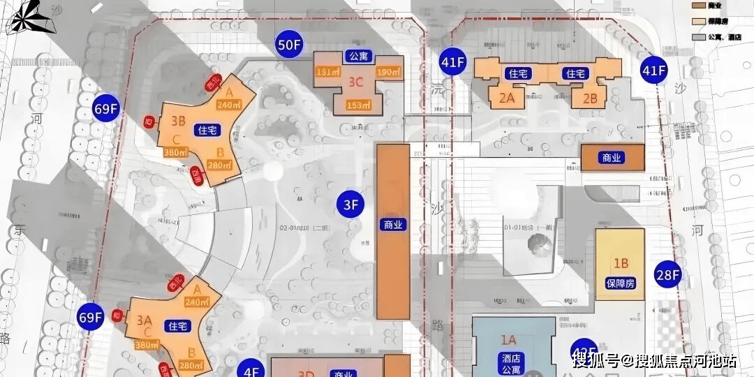 整个项目分两期开发建设,其中:项目一期东地块包含1栋酒店+商务公寓、1栋保障房、2栋包含一、二单元的住宅;西地块包含2栋高约250米的超高层住宅,另有1栋约50层高的商务公寓。