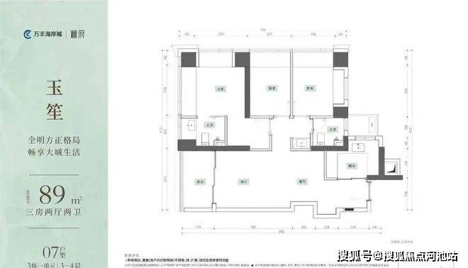 89㎡的3房2厅2卫,设计的是竖厅格局,客厅3.375米开间,LDKB一体化,S墙设计预留冰箱卡槽位,三开间朝南,动静分区,U型厨房,公卫三段式干湿分离,得房率约95%(包含赠送),阳台5.9m²西南朝向。赠送面积约14.69m²。