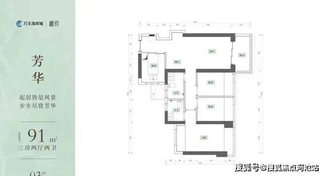 91㎡的3房2厅2卫,设计的是竖厅格局,客厅3.35米开间,LDKB一体化,S墙设计预留冰箱卡槽位,动静分区,U型厨房,公卫干湿分离,得房率约94%(包含赠送),阳台5.7m²东北朝向。赠送面积约11.27m²。