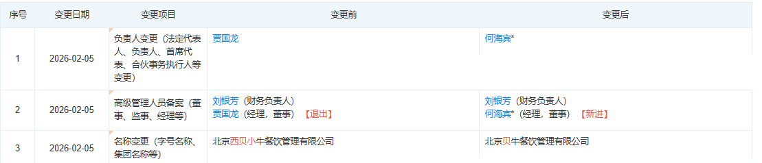 红星资本局2月9日消息,天眼查App显示,2月5日,北京西贝小牛餐饮管理有限公司发生工商变更,企业名称变更为北京贝牛餐饮管理有限公司,贾国龙卸任法定代表人,由何海宾接任。这距离1月27日贾国龙担任该公司法定代表人不足两周。