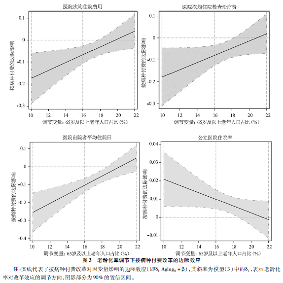 度量了在老龄化率的调节下,按病种付费改革对因变量的边际效应。其估计结果如图3所示:老龄化率正向调节了改革对医院次均住院费用、次均住院检查治疗费和出院者平均住院日的负向影响,即随着老龄化率的提高,改革对这三个指标的负向影响不断减弱,且逐渐变为不显著。同时,老龄化率负向调节了改革对公立医院住院率的正向影响,表明老龄化率较高的地区,改革导致的住院率上升现象被削弱。