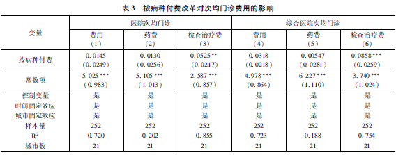 表3列(3)和列(6)的结果则显示,改革后,医院和综合医院次均门诊检查治疗费用显著上升。这表明,为了应对按病种付费针对住院病人定额支付的压力,医院可能会将住院病人的检查治疗安排在门诊中进行,从而导致次均门诊检查治疗费用上升。当前四川省大部分城市已经实施门诊共济改革,门诊检查治疗费用能够使用统筹基金报销。对于病人而言,在住院还是门诊做检查的费用差异相对较小,为医院将检查费用转嫁门诊创造了条件。