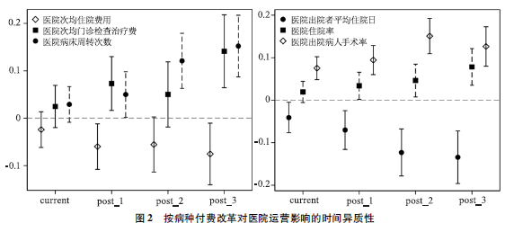 代表了实施按病种付费后第3年的政策效果。图2展示了以上回归模型的结果。如图2所示,按病种付费改革对医院运营的影响呈现随改革推进增强的趋势。