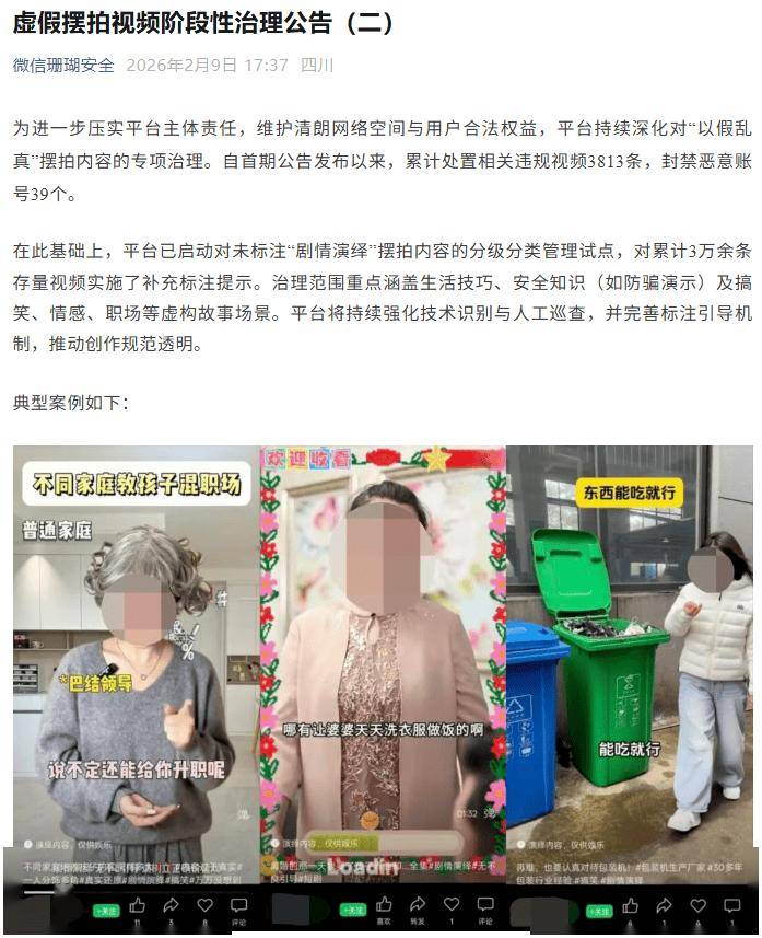 IT之家 2 月 9 日消息,微信今日发布虚假摆拍视频阶段性治理公告(二),为进一步压实平台主体责任,维护清朗网络空间与用户合法权益,平台持续深化对“以假乱真”摆拍内容的专项治理。自首期公告发布以来,累计处置相关违规视频 3813 条,封禁恶意账号 39 个。