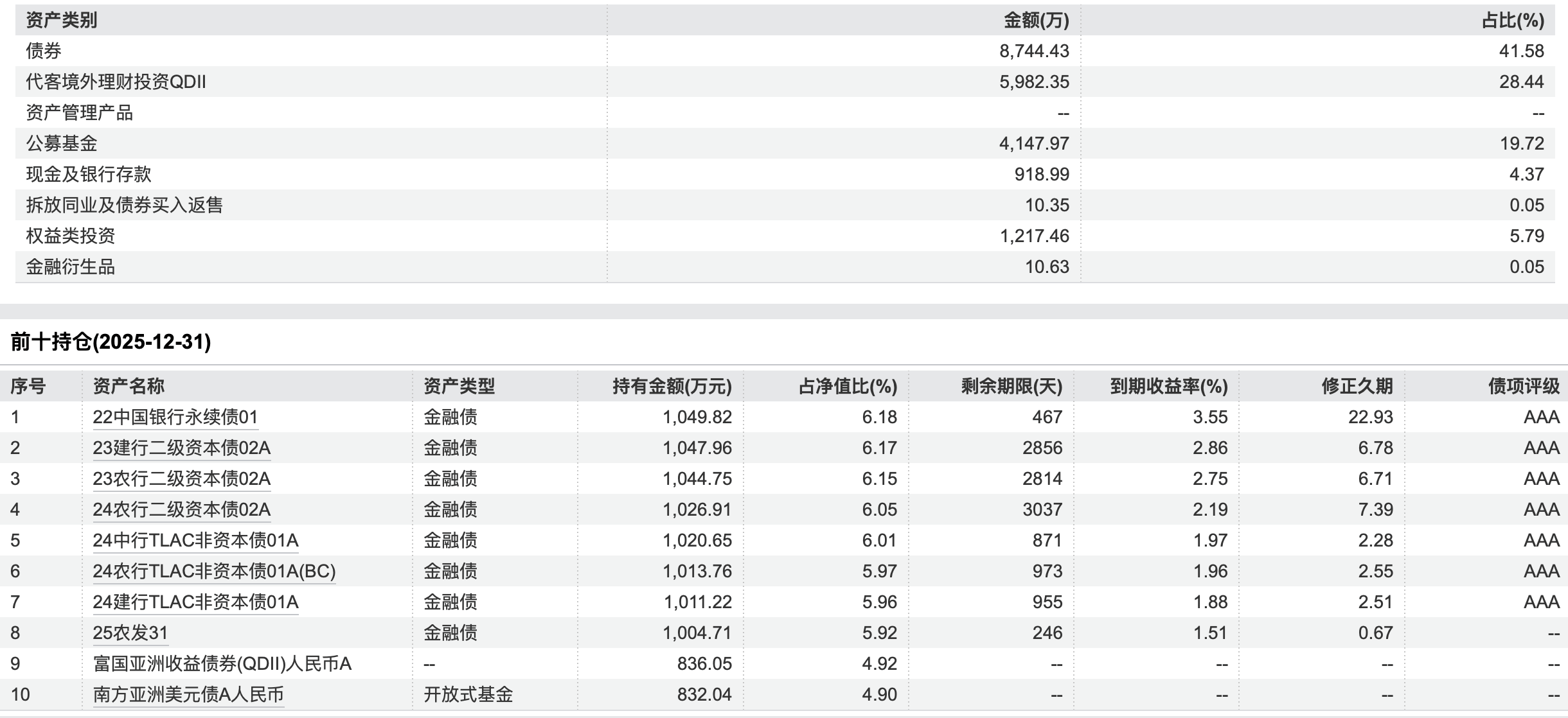 R3等级的偏债混合型产品2021年招银理财招智睿远积极(一年持有)103311以6.71%的月收益率紧随其后。该理财产品2025年年报穿透后资产配置显示,债券占比约四成、代客境外理财投资QDII占比近三成、公募基金占比近两成,前十大持仓产品绝大部分为金融债。