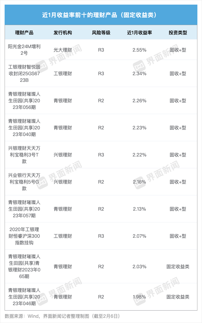 从具体的理财产品近1个月收益率表现看,根据Wind数据,在成立日期3个月以上、规模5000万元以上,由银行理财子公司发行的以公募方式募集的存续理财产品中(下同),近一个月收益率最高的固收类理财产品为阳光金24M增利2号,是由光大理财发行的一款固收+类理财产品,风险等级为R3,在同类排名中为前0.01%。
