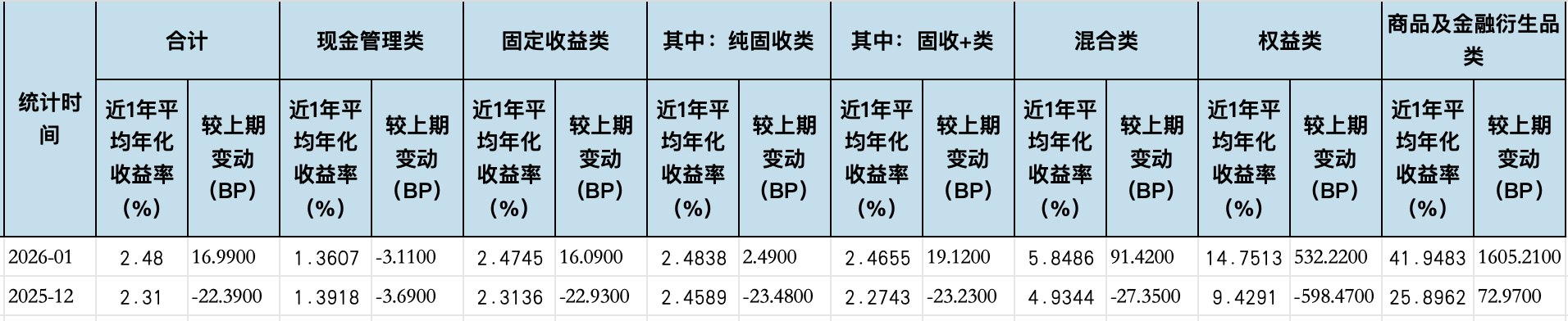 从全市场收益表现看,刚刚过去的2026年1月全市场近1年平均年化收益率环比增加近17个BP。根据普益标准最新数据,1月理财市场平均收益率为2.4784%,2025年12月这一数据为2.3085%。其中,固收+类、混合类、权益类理财产品近1年平均收益率环比增加明显,分别环比增加19.12BP、91.42BP、532.22BP,而现金管理类产品近1年平均收益率延续2025年12月的下滑态势,环比下降3.11BP,降至1.3607%。