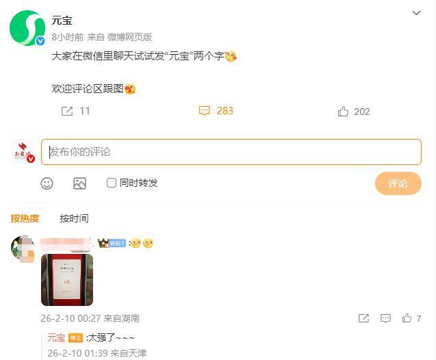 2月10日凌晨,@元宝 发文表示:大家在微信里聊天试试发“元宝”两个字。记者测试发现,微信发送“元宝”有福袋掉落,红包将直接存入微信零钱。