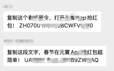 在微信屏蔽元宝和千问的红包链接后,元宝与千问将红包裂变分享的方式改为了复制口令形式。