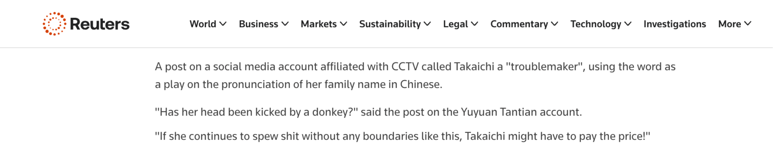 11月12日,中央广播电视总台言论评论品牌玉渊谭天迅速出战,发出评论《搞事的高市》,抨击高市早苗的错误言行。