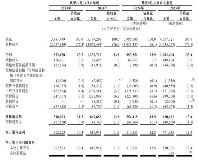 供应商方面,于2023年及2024年以及截至2025年9月30日止九个月,公司各期间来自五大供应商的采购额分别为7.65亿元、12.46亿元及12.88亿元,各占同期总采购额的34.8%、35.0%及41.4%。