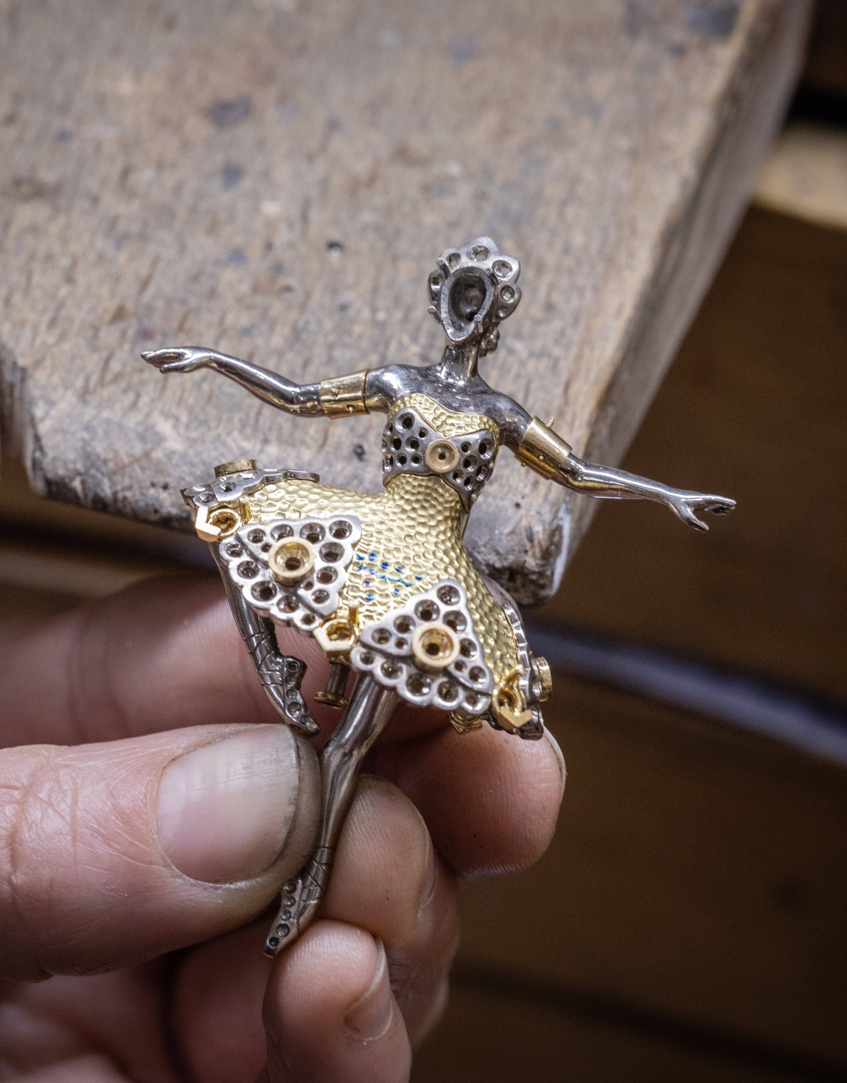 凝视那枚 Danse de Séville 芭蕾舞伶胸针,乔治·比才笔下的卡门,仿佛就在眼前旋转。抛光金质捕捉了弗拉门戈舞裙飞扬的瞬间,镶嵌在裙摆上的珍贵宝石不仅仅是色彩的点缀,它们是卡门那吉普赛灵魂中燃烧的火焰与叛逆。而在另一端,Rêverie de Coppélius 胸针 则将我们带入了《葛蓓莉亚》的机械童话,工匠们用精湛的漆艺赋予了衣袖以织物的质感,那个想要拥有灵魂的人偶少女,在这一刻拥有了比肉身更为长久的永恒。