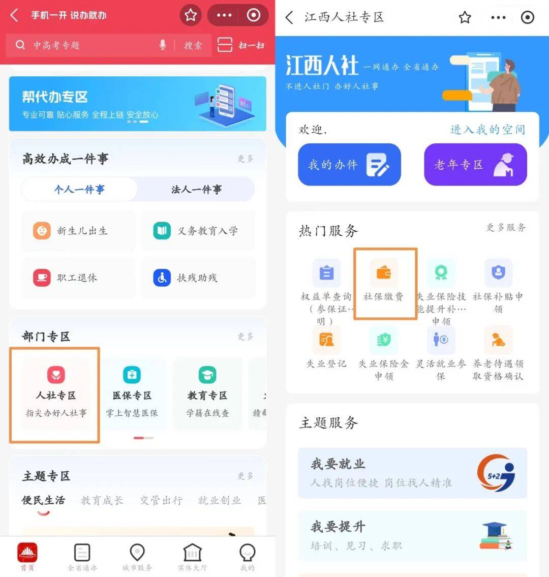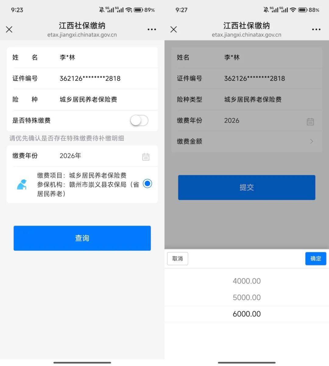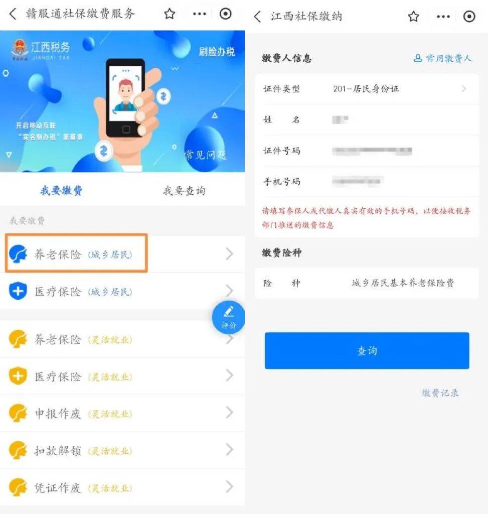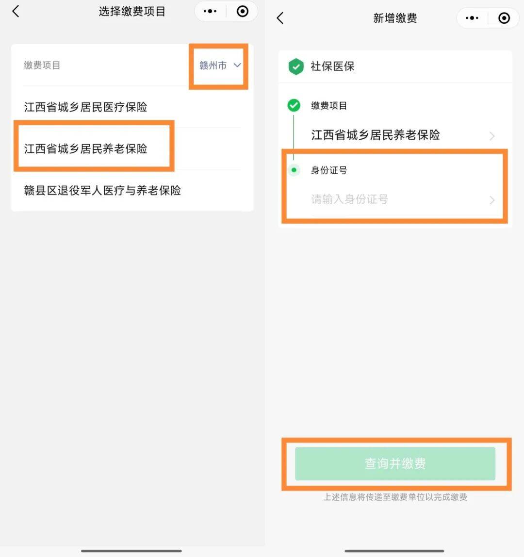 打开微信,点击右下角“我”→“服务”→“生活缴费”→“社保医保”,先选择参保地市,再选择“江西省城乡居民养老保险”,输入身份证号码及姓名,选择缴费类型,即可完成缴费。