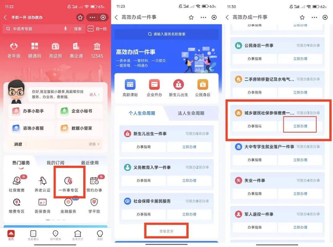 步骤一:打开赣服通APP或支付宝赣服通小程序→找到一件事专区→点击“查看更多”→找到“城乡居民社保参保缴费一件事”→点击“立即办理”。