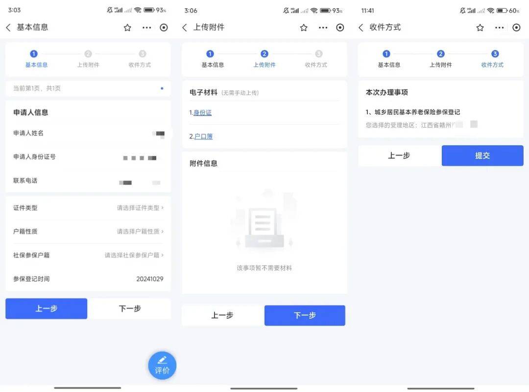 步骤三:按指示完成信息录入→填报信息、上传材料、填写收件信息→点击“提交”即可完成城乡居民基本养老保险参保登记。