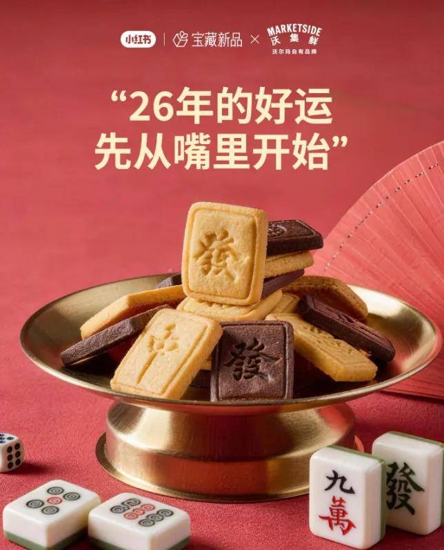 观察沃尔玛这批联名推出的19款商品,它们彻底跳脱了商超“功能优先”的逻辑,更具有精心设计的情绪属性。像是以“沃集鲜把把赢麻将曲奇”为例,49.9元一盒的饼干,被做成麻将造型且内含“天牌”,恰好击中国人春节“讨彩头”的心理期待。