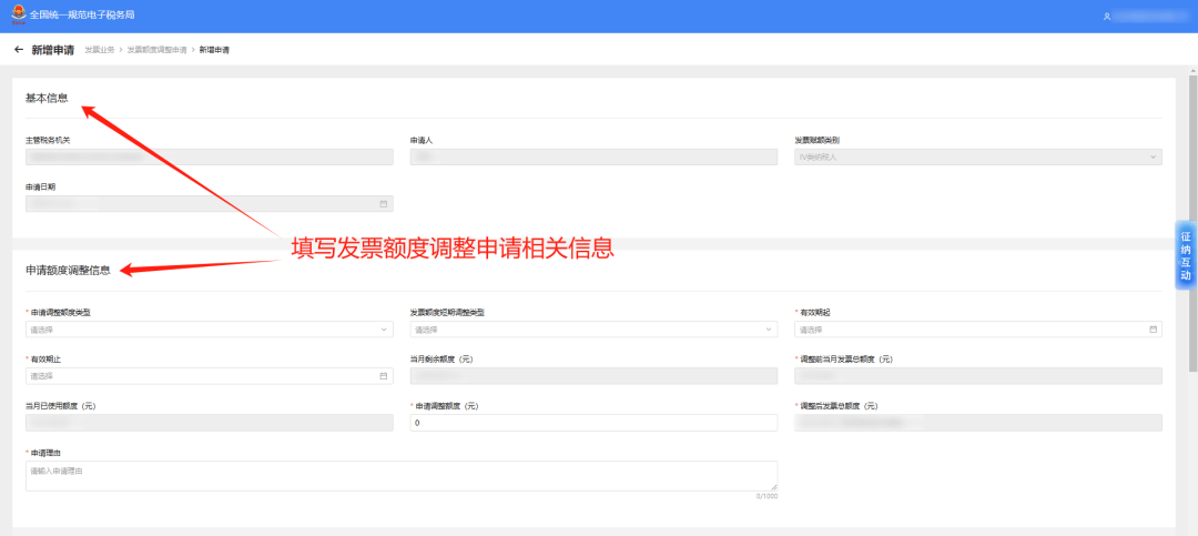 点击【新增申请】按钮,弹出发票额度新增申请页面,填写发票额度调整申请相关信息,上传相关附件资料。提交本次调整申请记录。