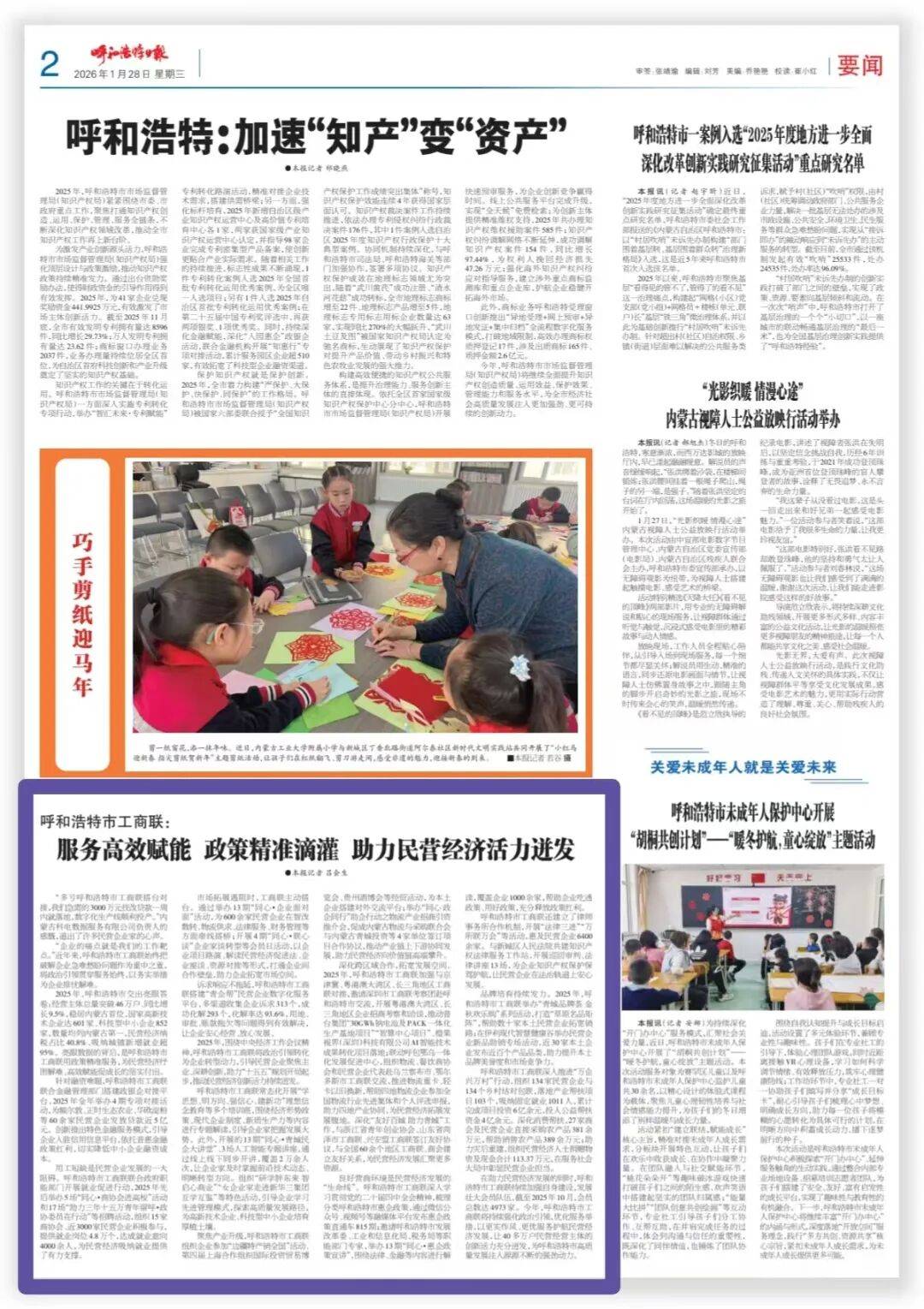 2025年,呼和浩特市交出亮眼答卷:经营主体总量突破46万户、同比增长9.5%,稳居内蒙古首位,国家高新技术企业达601家、科技型中小企业852家,数量均列内蒙古第一,民营经济纳税占比40.8%、吸纳城镇新增就业超95%。亮眼数据的背后,是呼和浩特市工商联用政策精准服务,为民营经济纾困解难、高效赋能促成长的坚实付出。