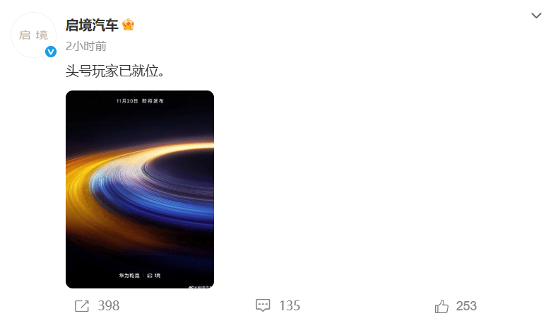 11月14日,启境汽车通过其官方社交平台发布了一张预热海报,正式宣告品牌即将亮相。海报以“头号玩家已就位”为标语,搭配“开启新境”、“11月20日即将发布”及“华为乾崑”等关键词,迅速在行业内引发关注。