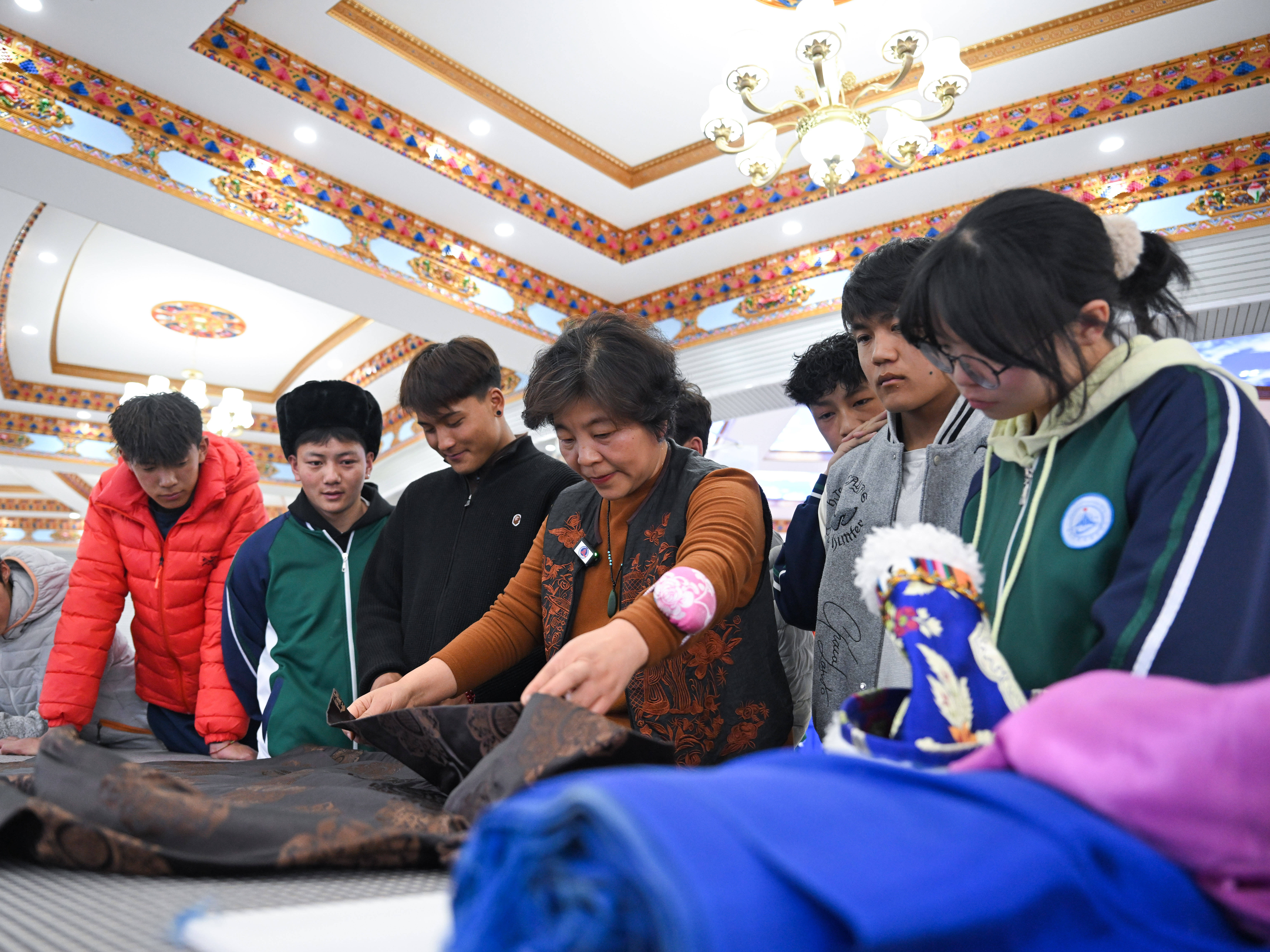 3月30日,在青海省海北藏族自治州职业技术学校,山东援青教师丁连翠(右二)在指导学生实操。 新华社记者 张龙 摄
