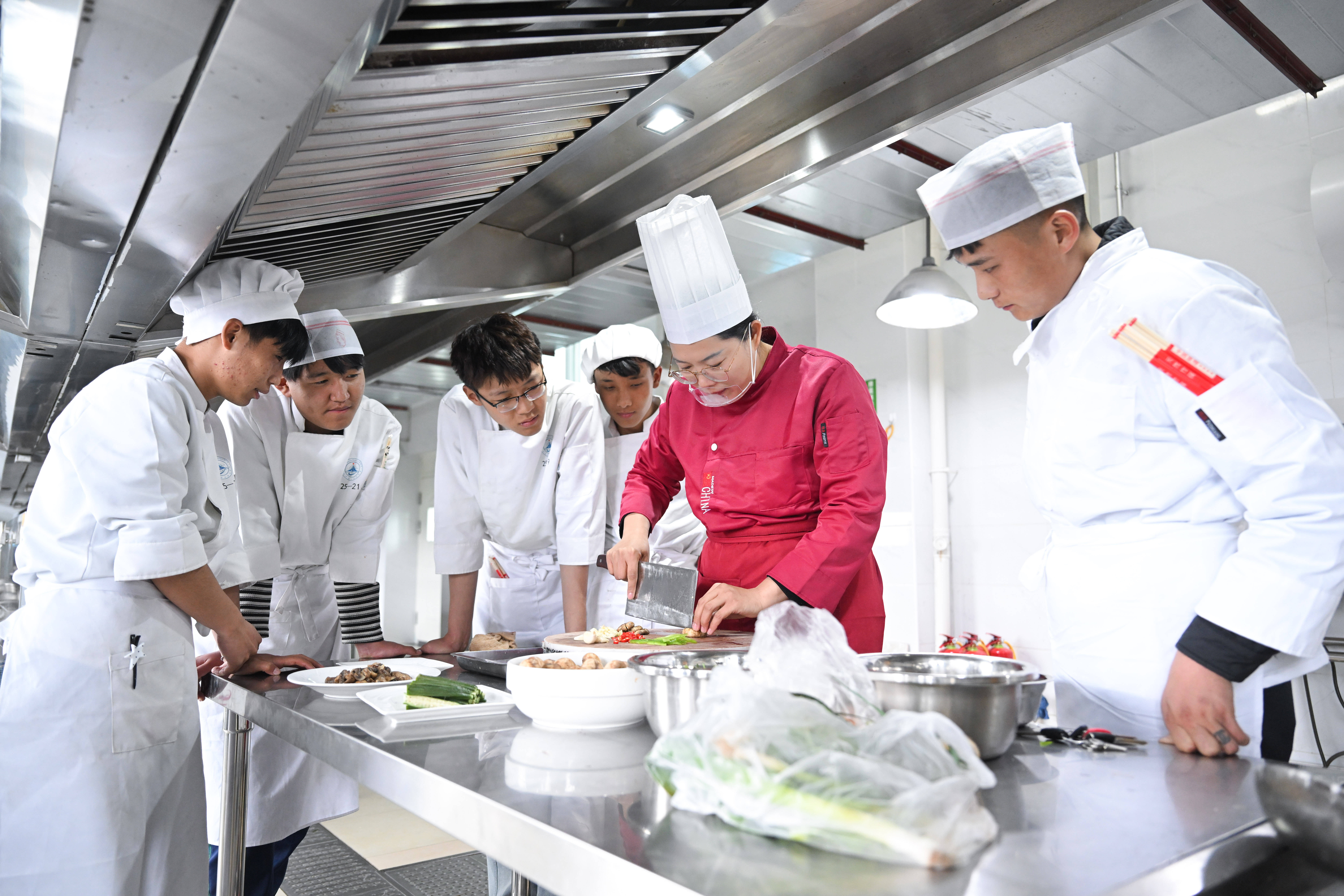 3月30日,在青海省海北藏族自治州职业技术学校,山东援青教师王兆红(左四)在指导学生实操。 新华社记者 张龙 摄