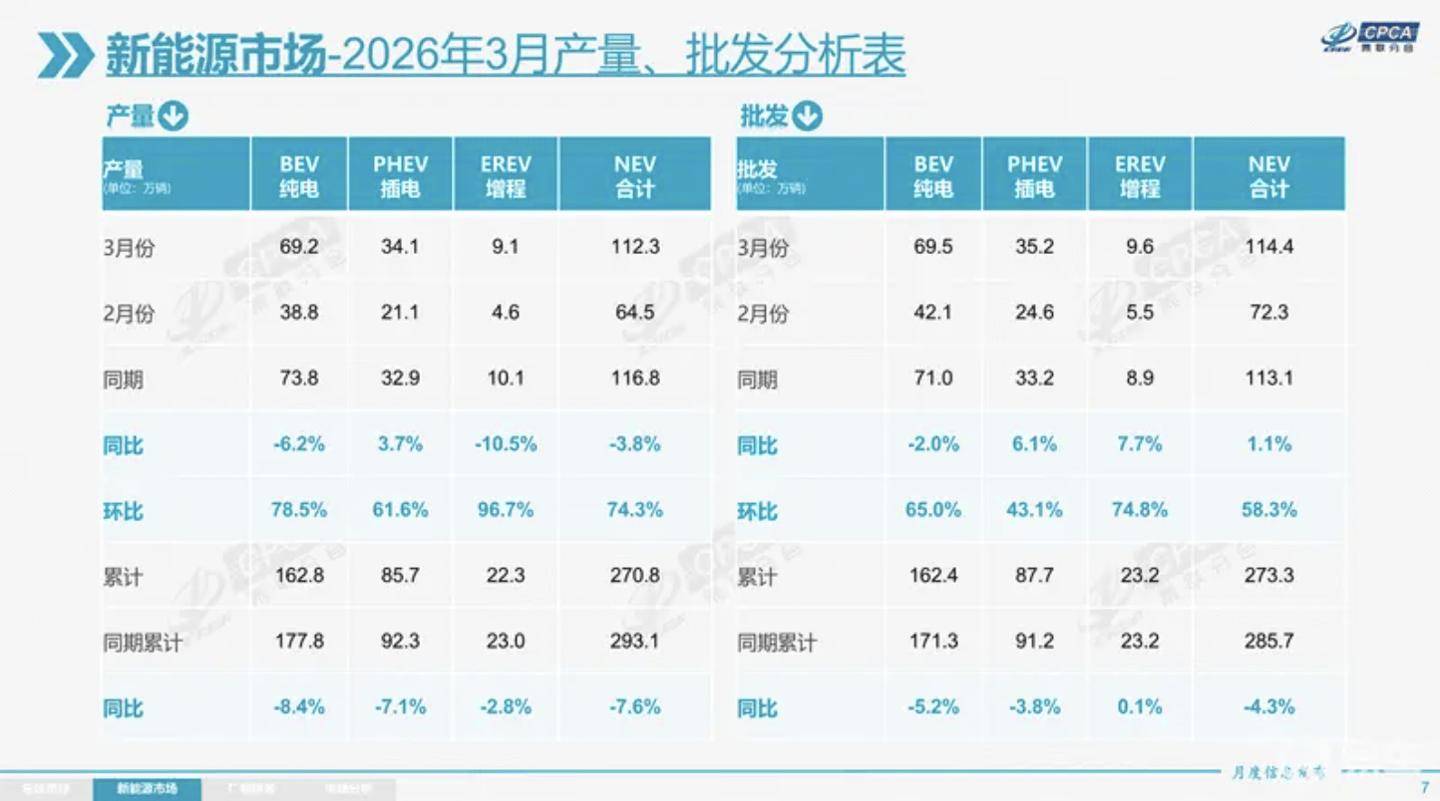 3 月新能源乘用车生产达到 112.3 万辆,同比下降 3.8%,环比增长 74.3%。1-3 月累计新能源乘用车生产达到 270.8 万辆,同比下降 7.6%。3 月新能源乘用车批发销量达到 114.4 万辆,同比增长 1.1%,环比增长 58.3%;1-3 月新能源乘用车批发销量达到 273.3 万辆,同比下降 4.3%。