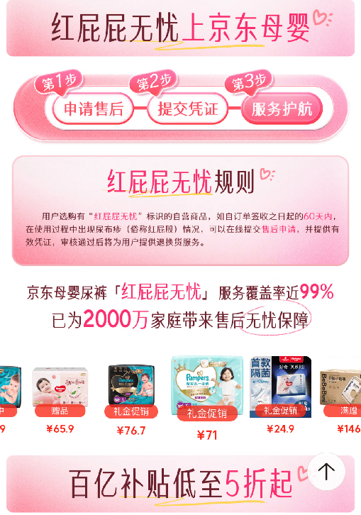 值得一提的是,京东超市此前就推出了“红屁屁无忧”服务,通过为敏感宝宝提供纸尿裤免费退换服务,全面呵护宝宝的屁屁健康,缓解新手父母的焦虑情绪,同时也有效降低家庭育儿成本。