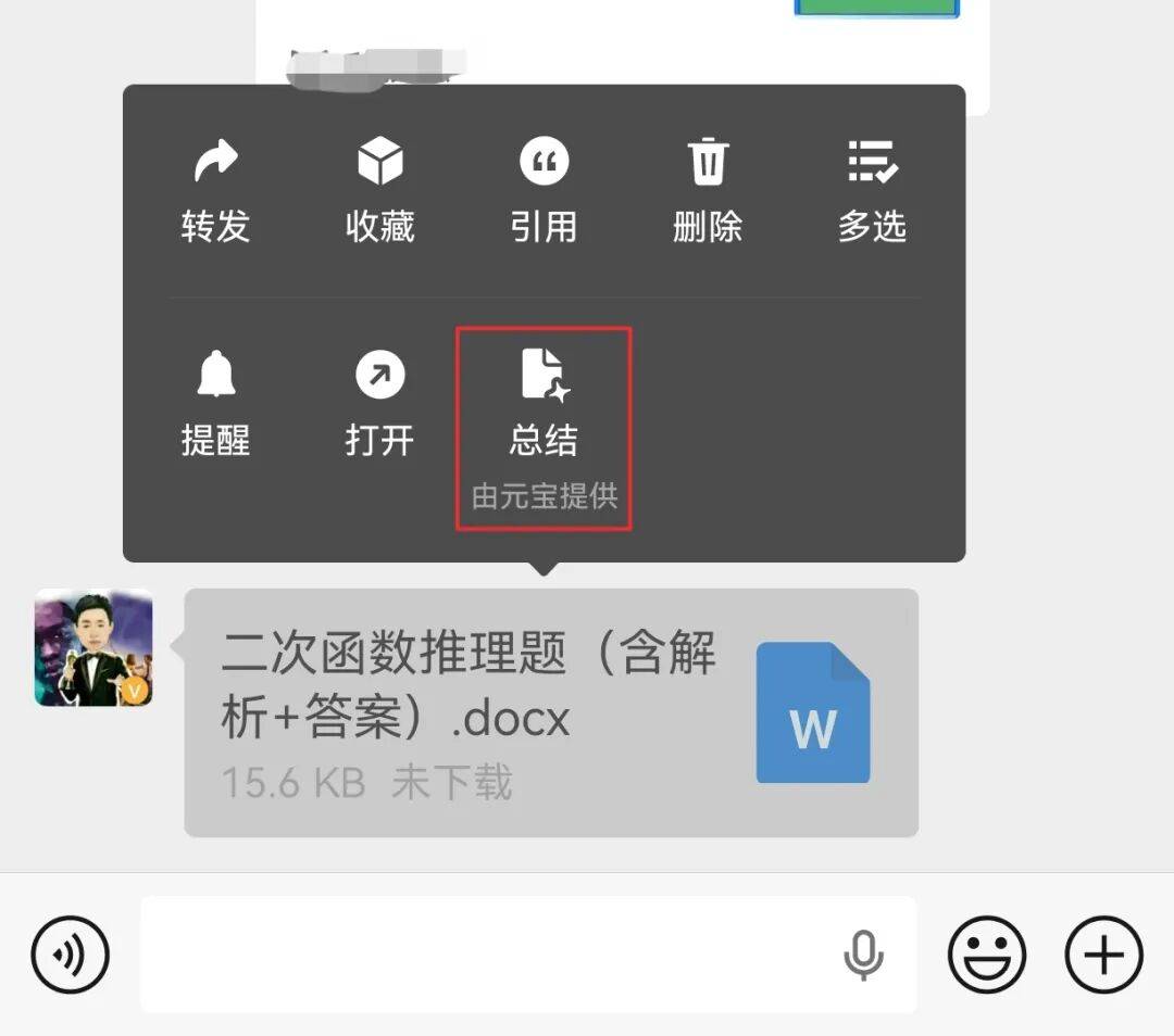 当我们收到微信好友发送过来的文件时,只需要在这个文件上面长按2秒,就会发现弹出菜单中增加了一个“总结”的选项,并且在下方显示“由元宝提供”的灰色字样。