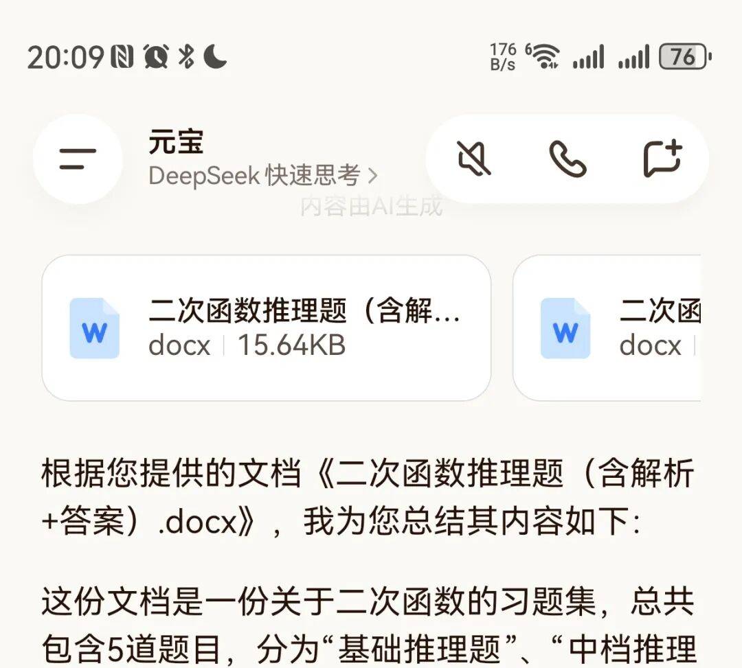 点击“总结”的选项之后,会自动跳转到元宝APP中进行后续的操作。元宝会自动上传这个文件,然后你需要点一下发送按钮,元宝就会自动总结出该文件的主要内容,不但准确还很全面,而且还支持对该文件的进一步互动,非常方便。