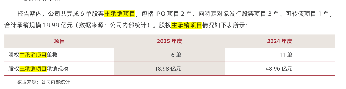 2025年,中泰证券共完成6单股票主承销项目,包括IPO项目2单、向特定对象发行股票项目3单、可转债项目1单,合计承销规模18.98亿元。