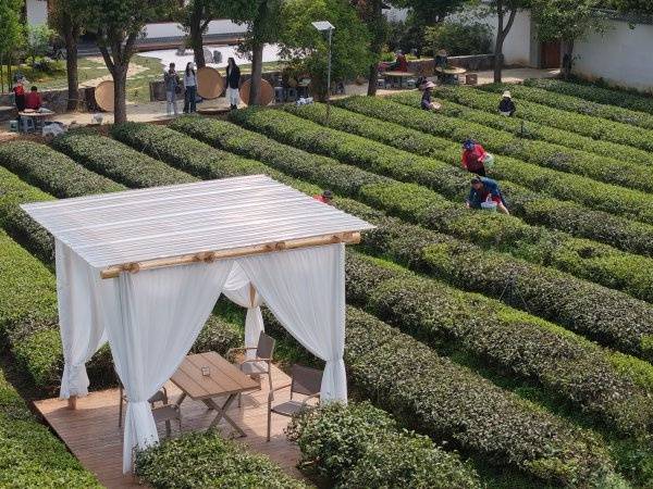 在这片青绿的茶园里,几座宋式亭台掩映其间,白色纱帐随风轻舞。游客可以在此品茗、尝点心、观景,甚至欣赏一场雅致的茶艺表演。她精心复刻了心中的东方美学梦境,目标是为疲惫的都市人亲手打造的一方“心灵疗愈所”。