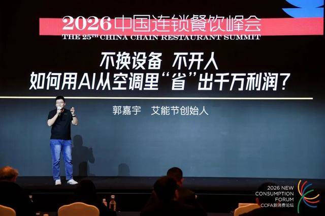 4月7-9日,CCFA新消费论坛——2026中国连锁餐饮峰会于上海举行。本次峰会以“探寻下一个五年的确定性机会”为主题,围绕宏观政策解读、热门赛道洞察、前沿技术落地、全产业链资源精准对接等核心议题展开,构建覆盖行业全周期发展需求的深度交流生态。在这场行业盛会上,上海艾能节智能科技有限公司(简称艾能节)受邀参会,创始人郭嘉宇在峰会主论坛带来题为《不换设备、不开人,如何用AI从空调里“省”出千万利润》的精彩分享。他指出:利润增长充满挑战,而管理优化与成本控制,才是那个可以牢牢握住的“确定性”。
